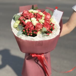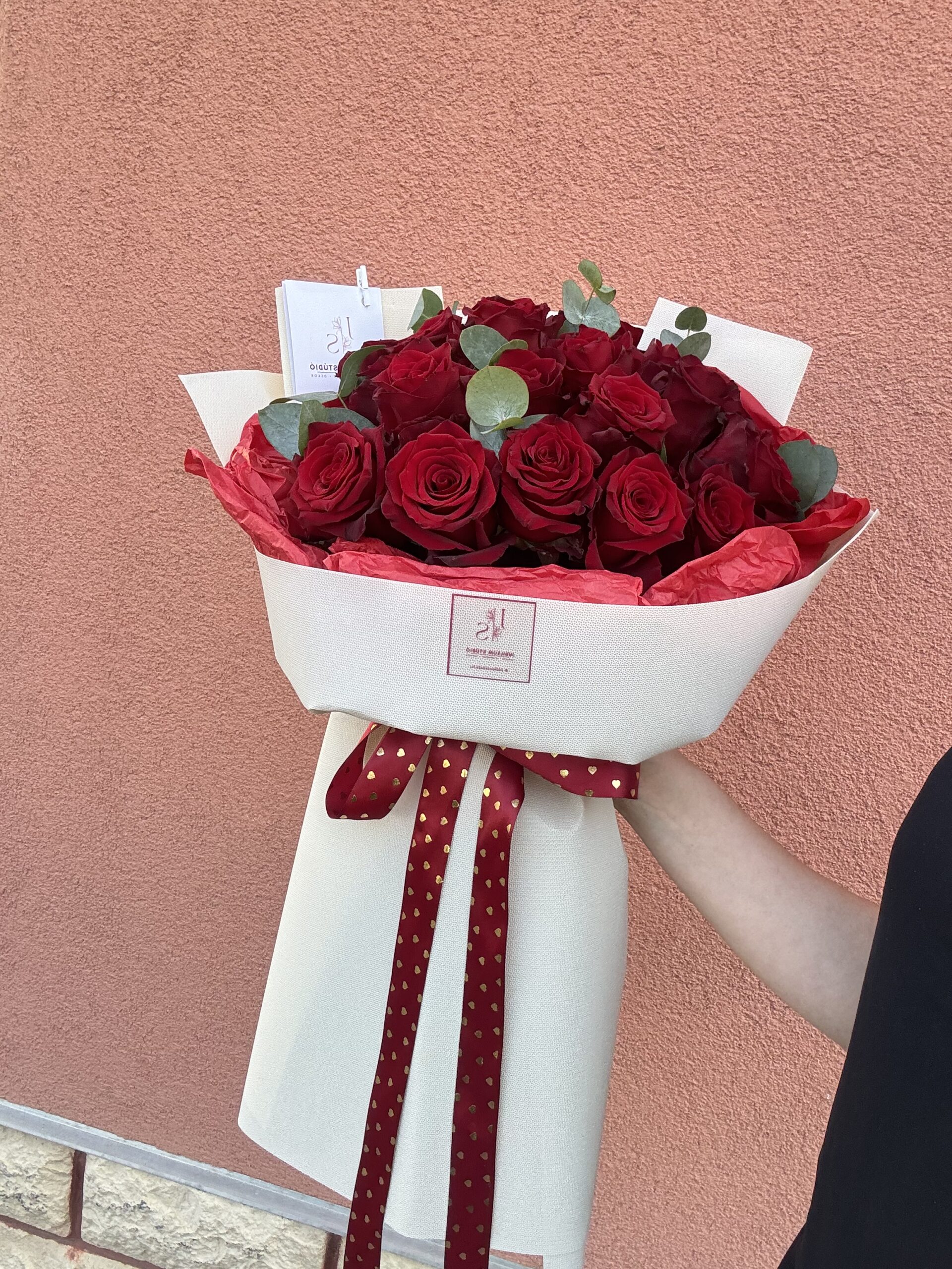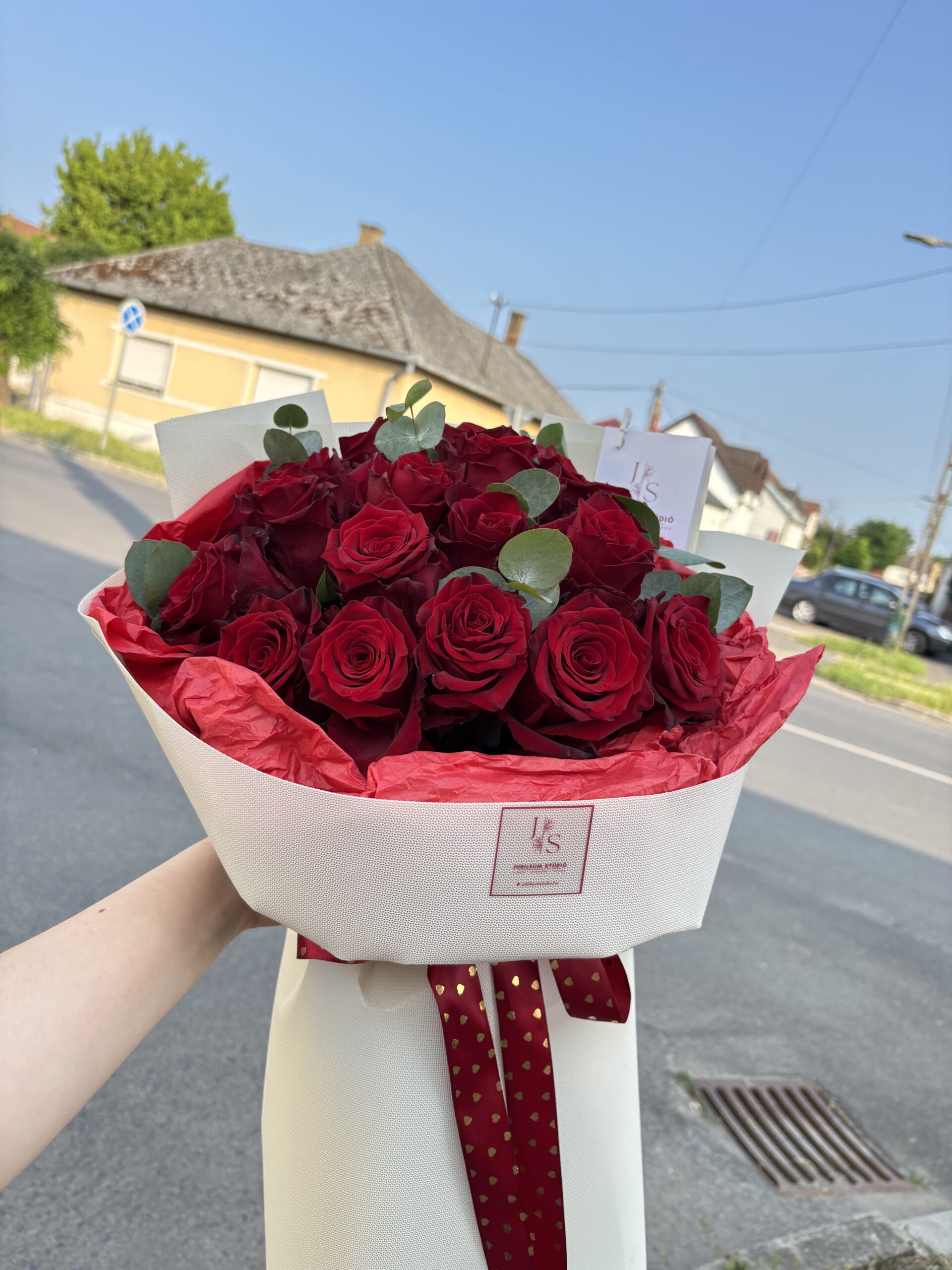 Ez az elegáns és letisztult vörös rózsa csokor a romantika időtlen szimbóluma. A csokor dúsan megkötött prémium minőségű, bársonyos vörös rózsákból áll, melyet finoman kiegészítenek a dekoratív zöld levelek és a stílusos, krémszínű csomagolás. A piros szalag apró arany szívekkel még különlegesebbé teszi az összhatást. Ideális választás évfordulóra, születésnapra, Valentin-napra vagy csak úgy – mert a szeretetet mindig érdemes kimutatni.