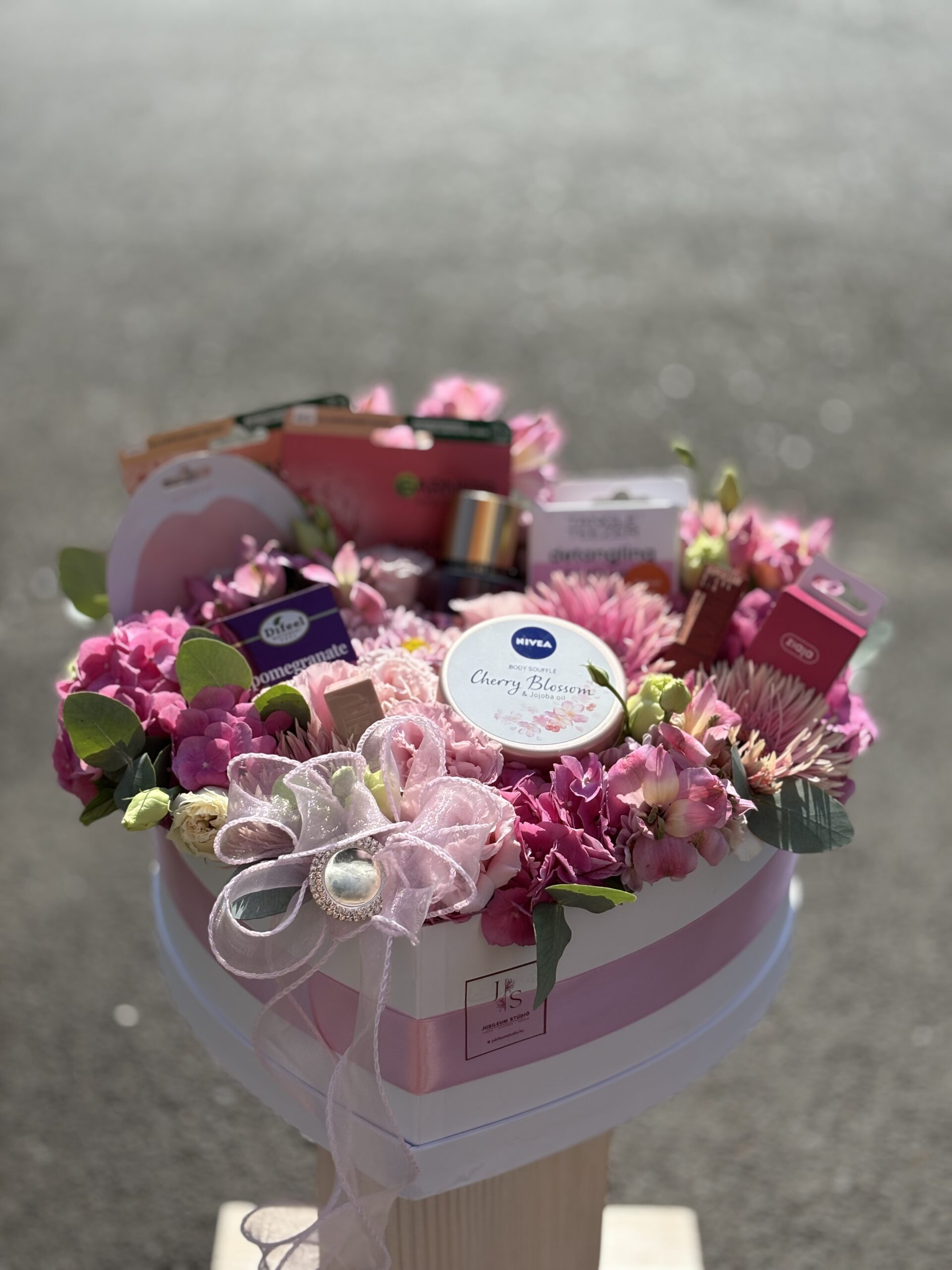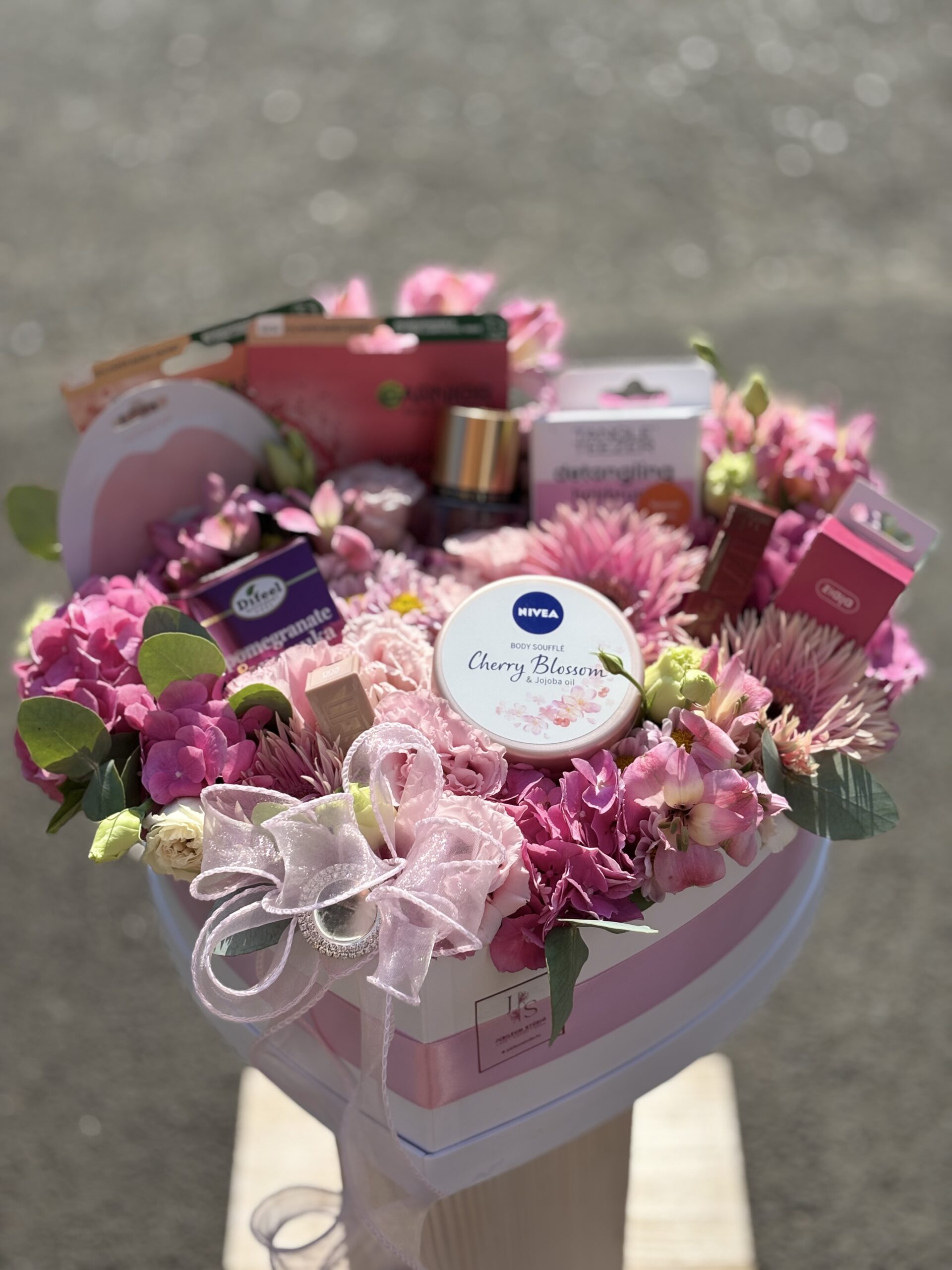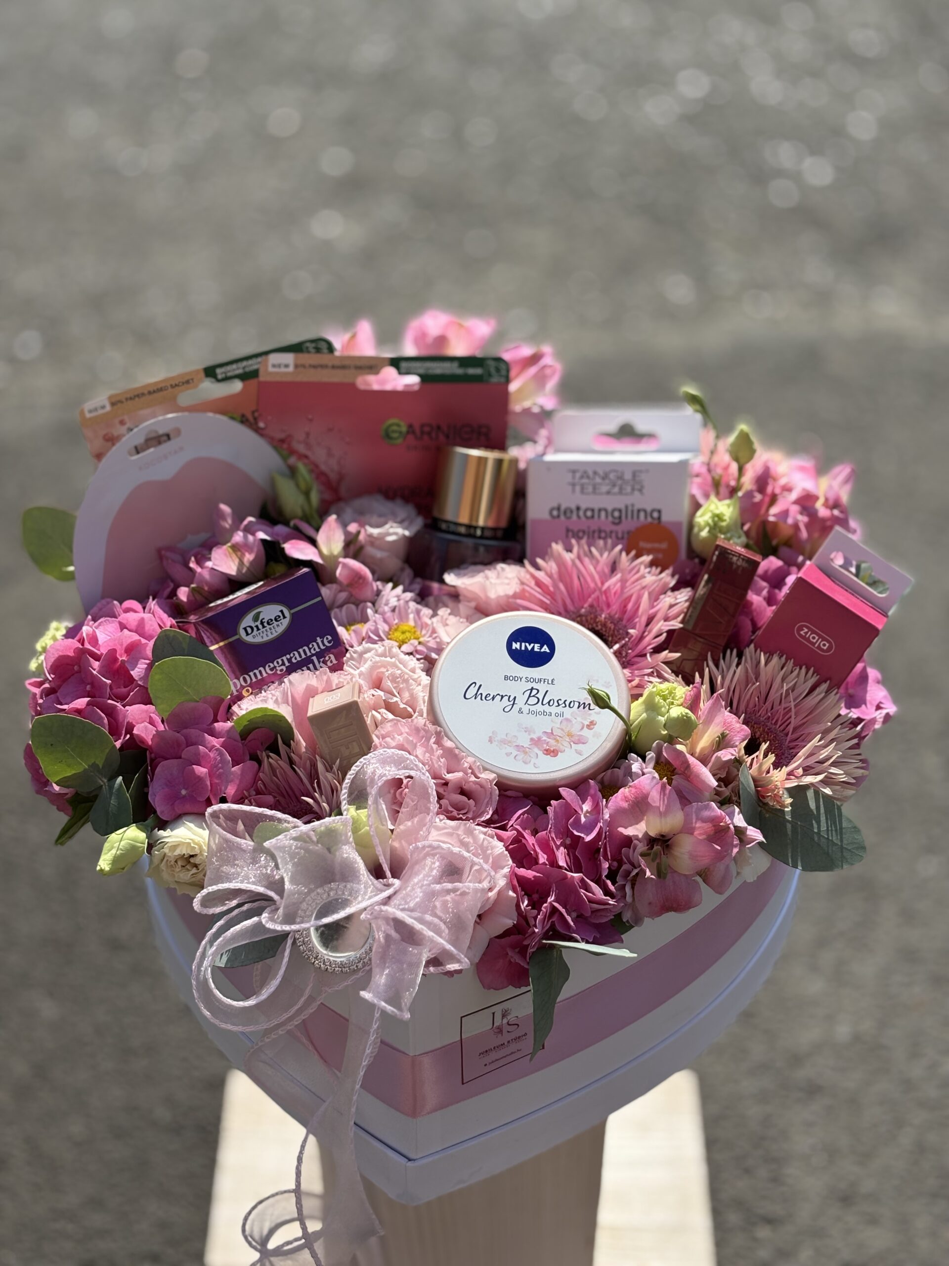 Különleges, személyre szabott meglepetésdoboz, amelybe a vásárló által hozott szépségápolási termékeket rendeztük virágos kompozícióba. Tökéletes születésnapra, köszönetnyilvánításra vagy bármilyen alkalomra, ha valami igazán egyedit keresel.