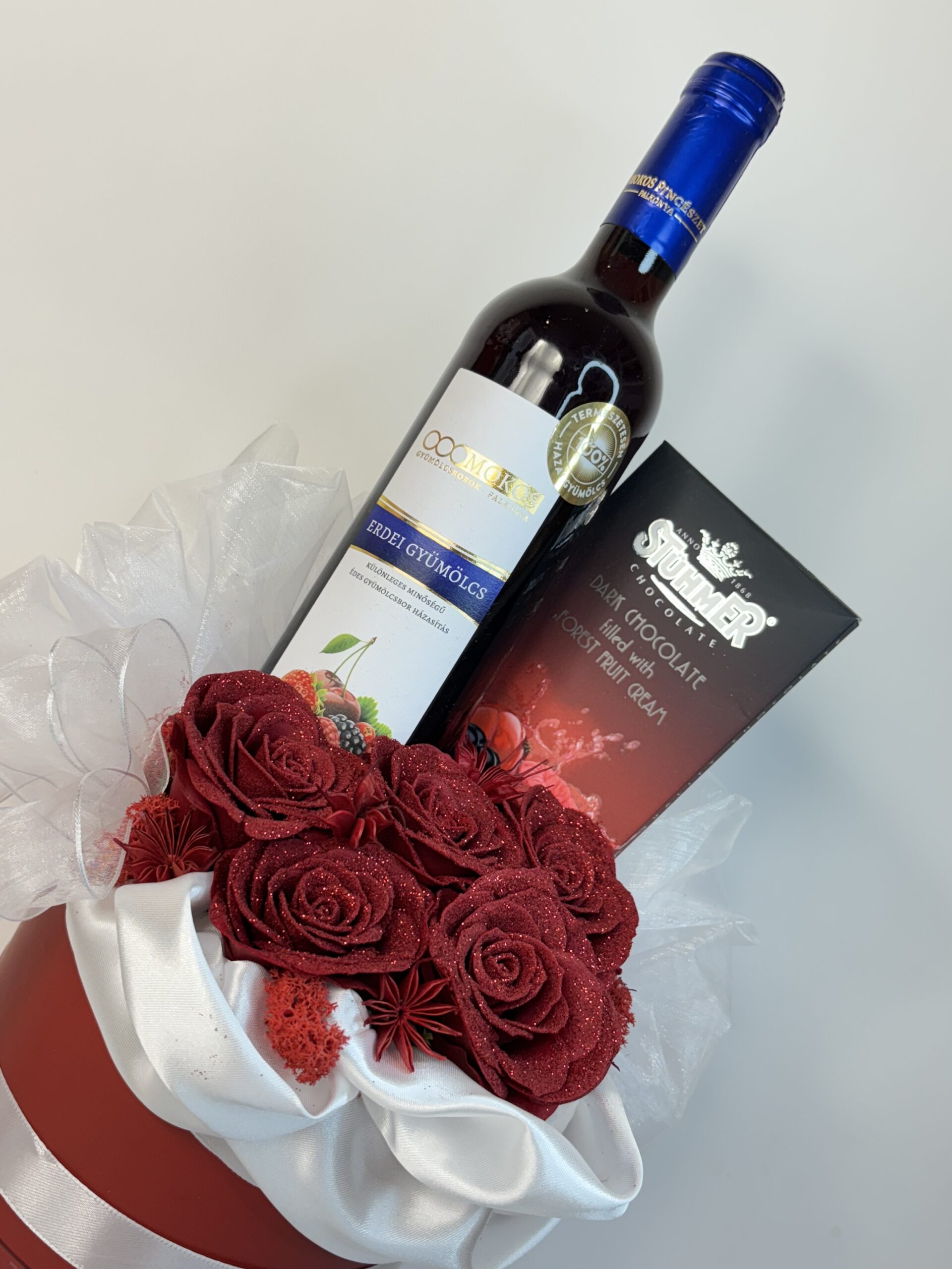 Lepd meg szerettedet egy szenvedéllyel teli ajándékkal, amelyben minden a gyümölcsös finomságokról és a különleges hangulatról szól! A Mokos erdei gyümölcsbor, a Stühmer étcsokoládé és a díszdoboz vörös színvilága tökéletes harmóniában varázsol romantikus és elegáns meglepetést.