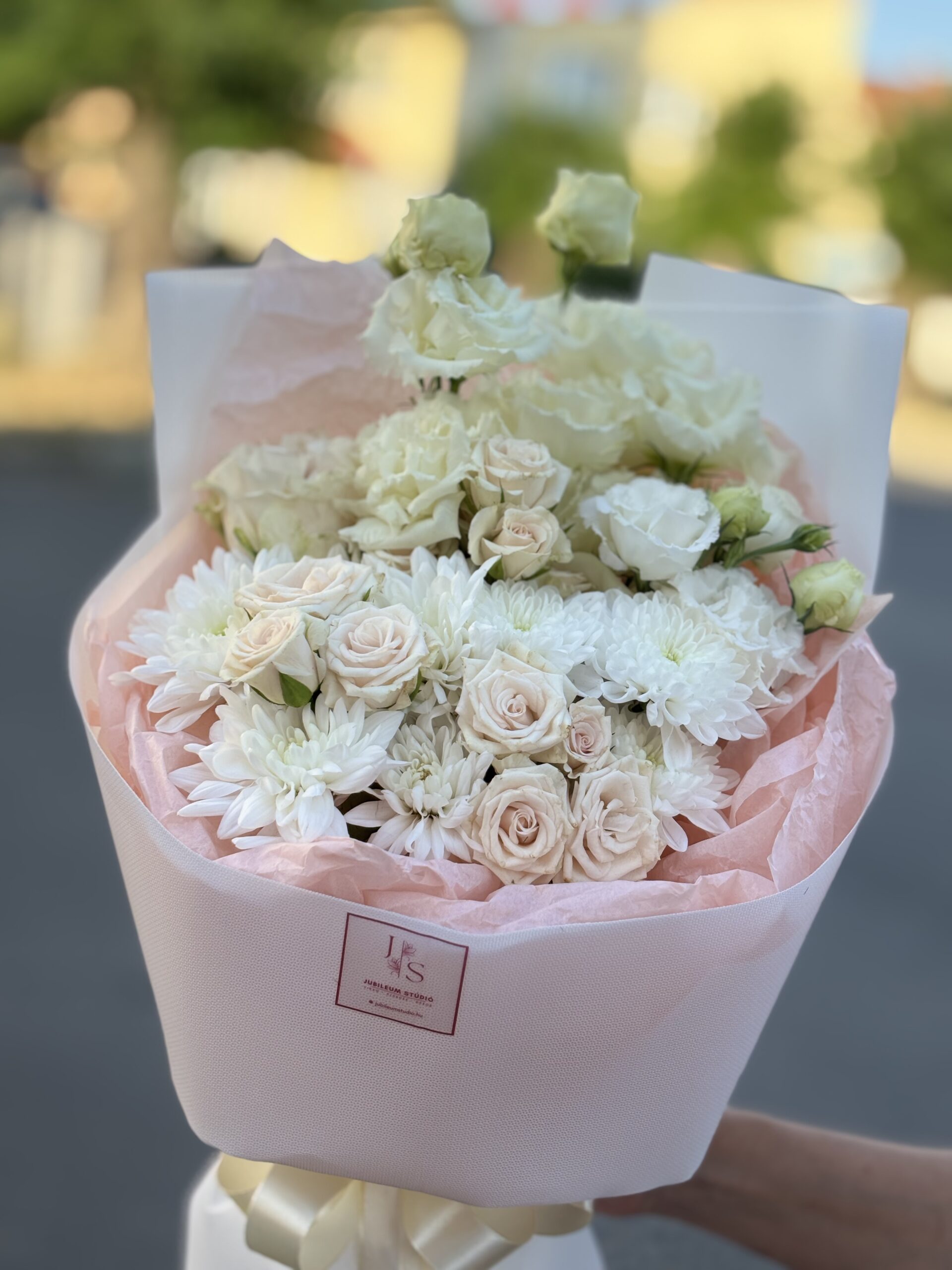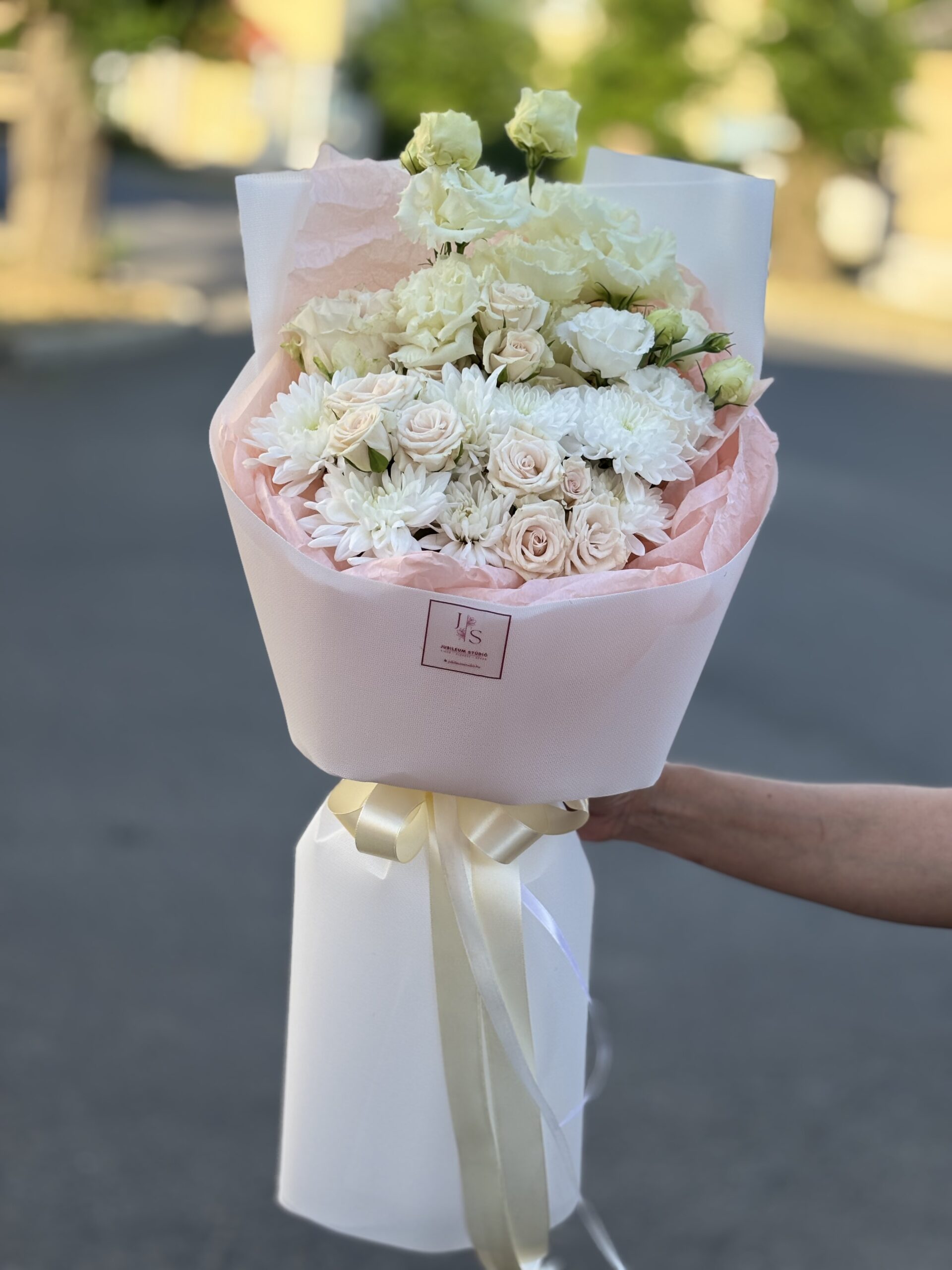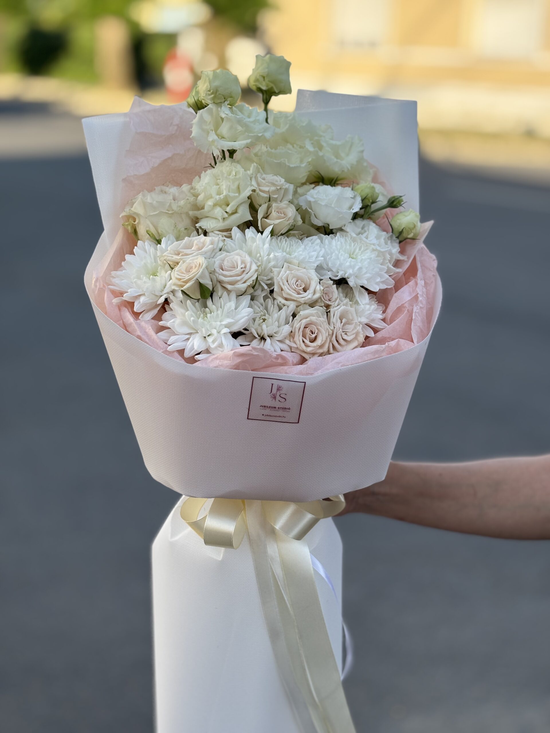 Lágy, krémes árnyalatú rózsák, fehér krizantémok és elegáns lisianthus szirmok – ez a csokor a kifinomult letisztultság megtestesítője.