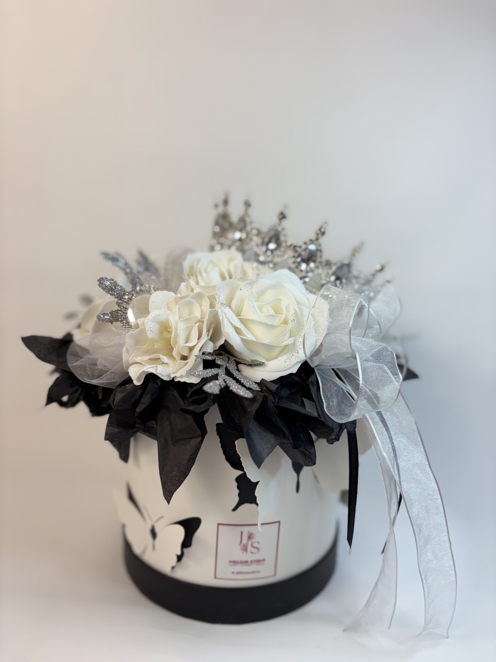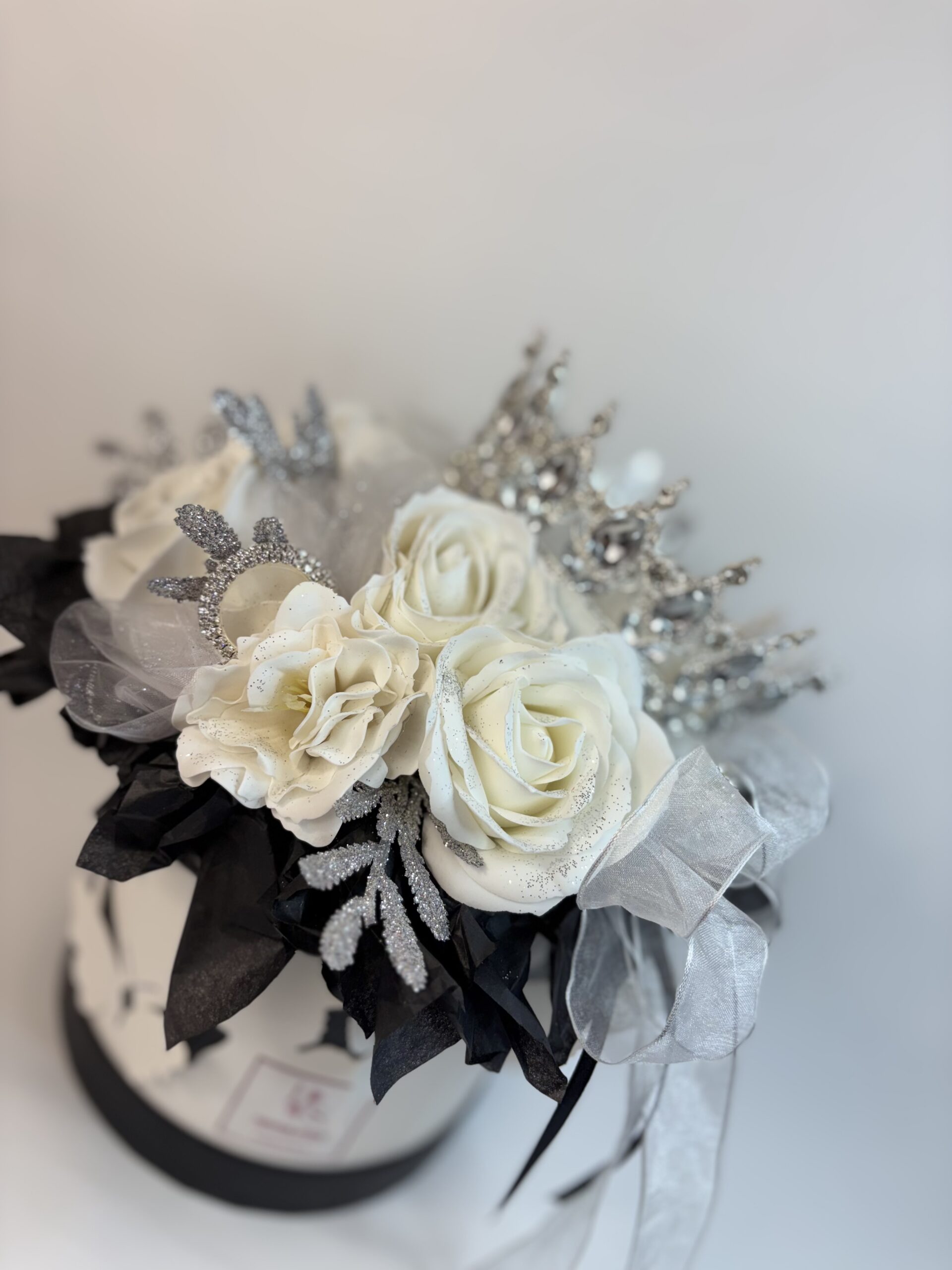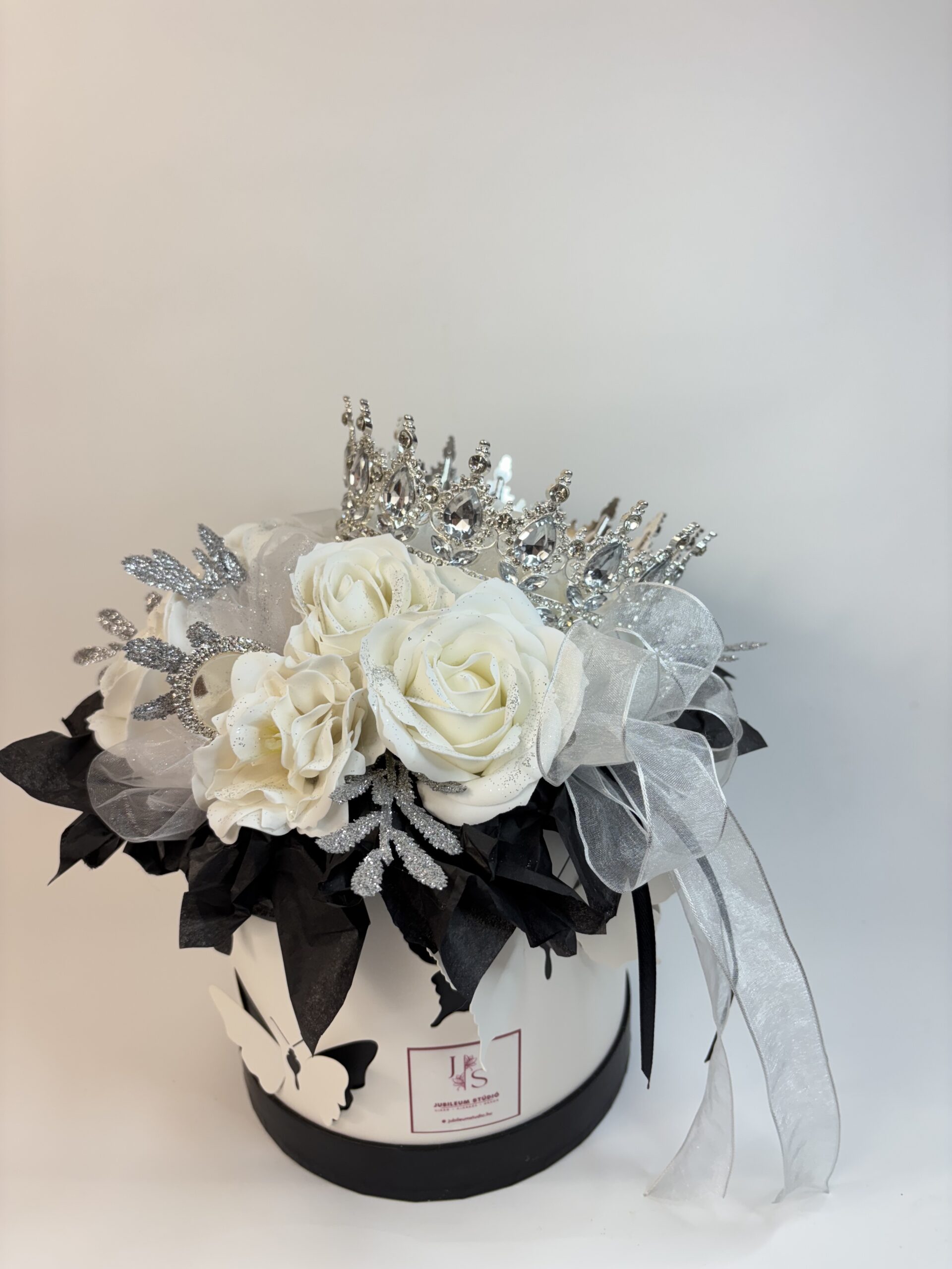Ajándékozz valódi királynői élményt szerettednek ezzel a lélegzetelállító ajándékdobozzal! A fehér rózsák, csillogó ezüstdíszítés és a káprázatos korona együttese a luxus és kifinomultság tökéletes megtestesítője – különleges alkalmakra, különleges embereknek.