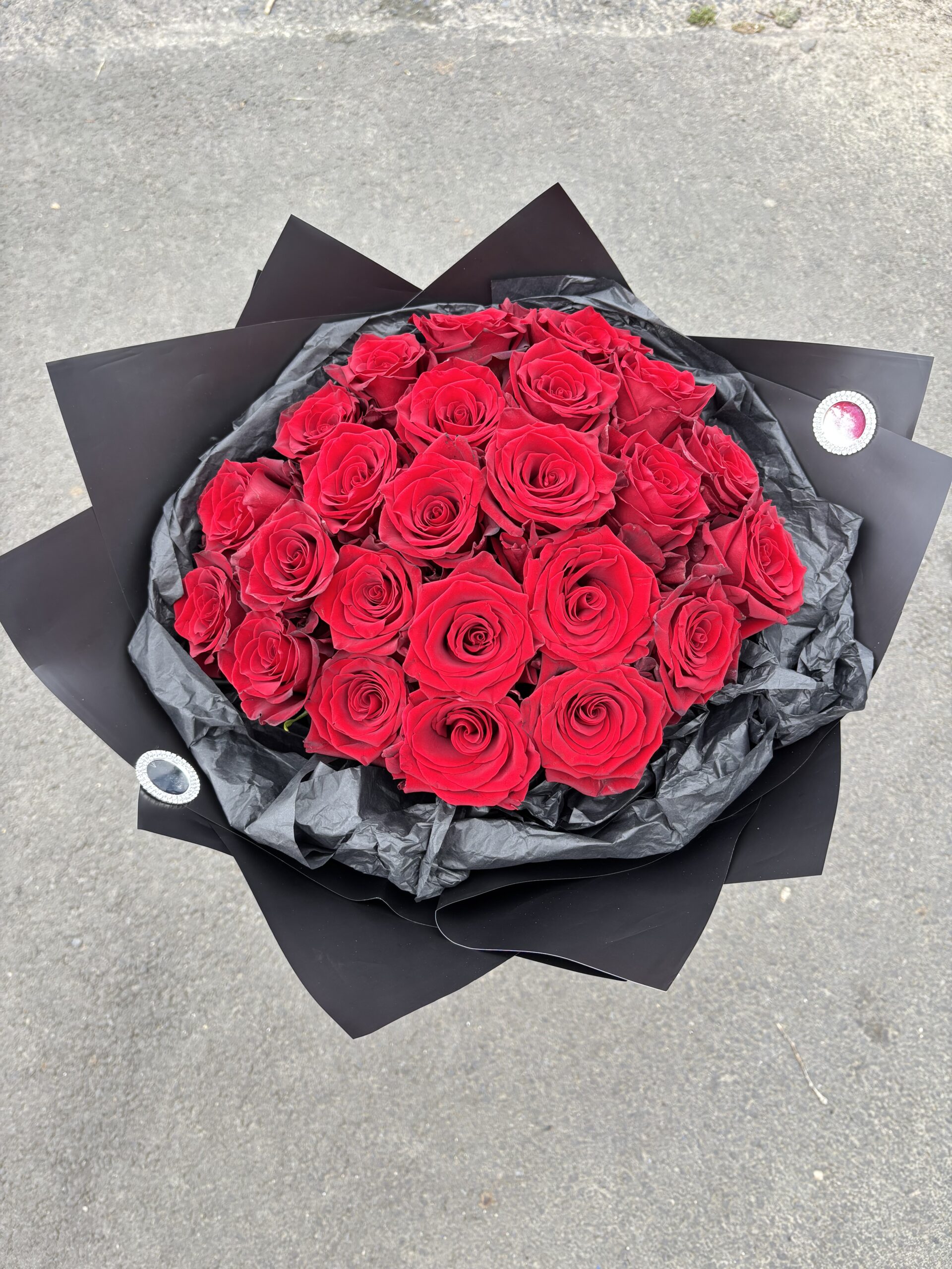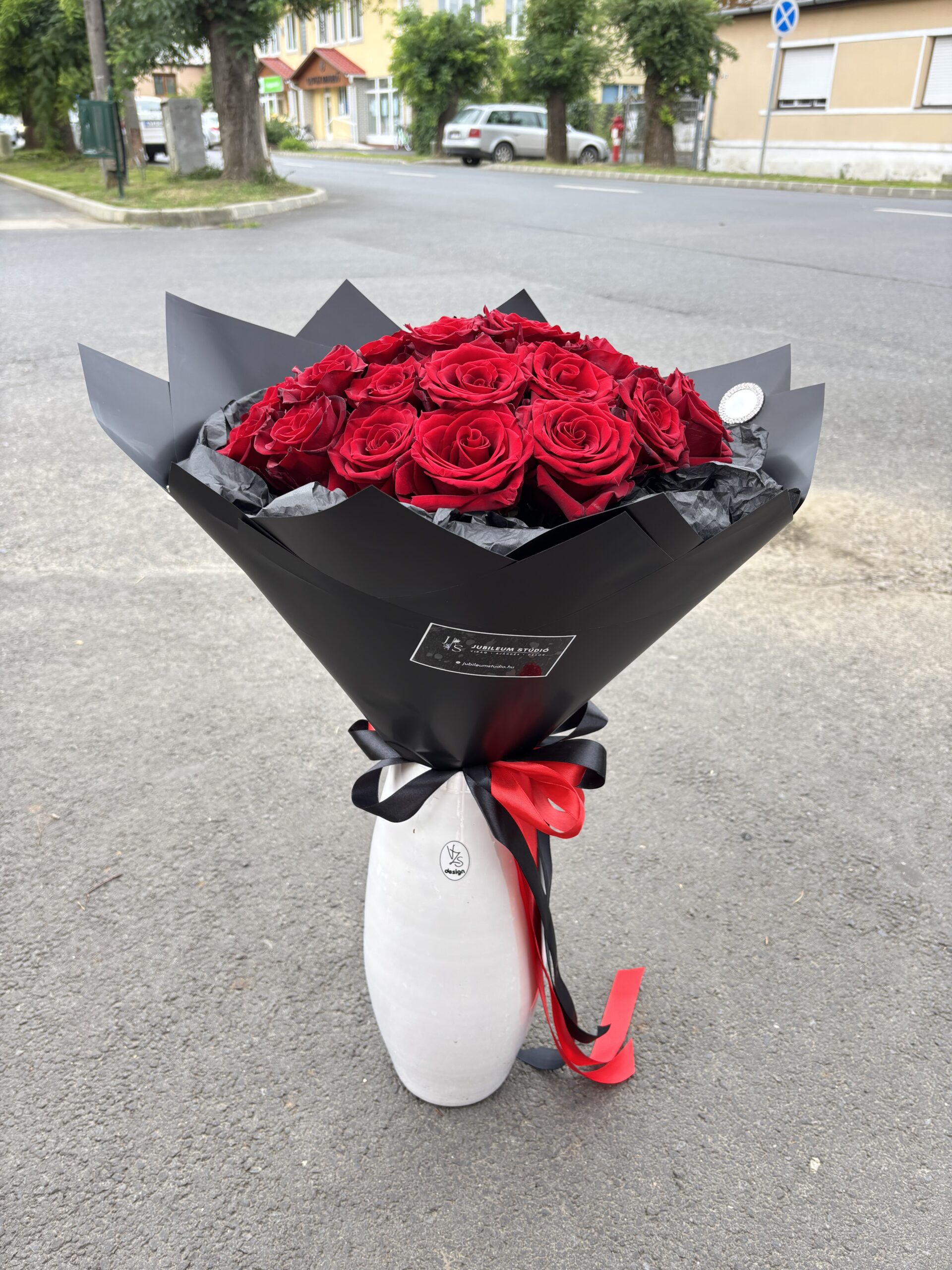 Luxus rózsacsokor fekete díszcsomagolásban, elegáns szalaggal – tökéletes választás, ha igazán emlékezetes ajándékot keresel. Az ár egyeztetés telefonon vagy emailben történik.