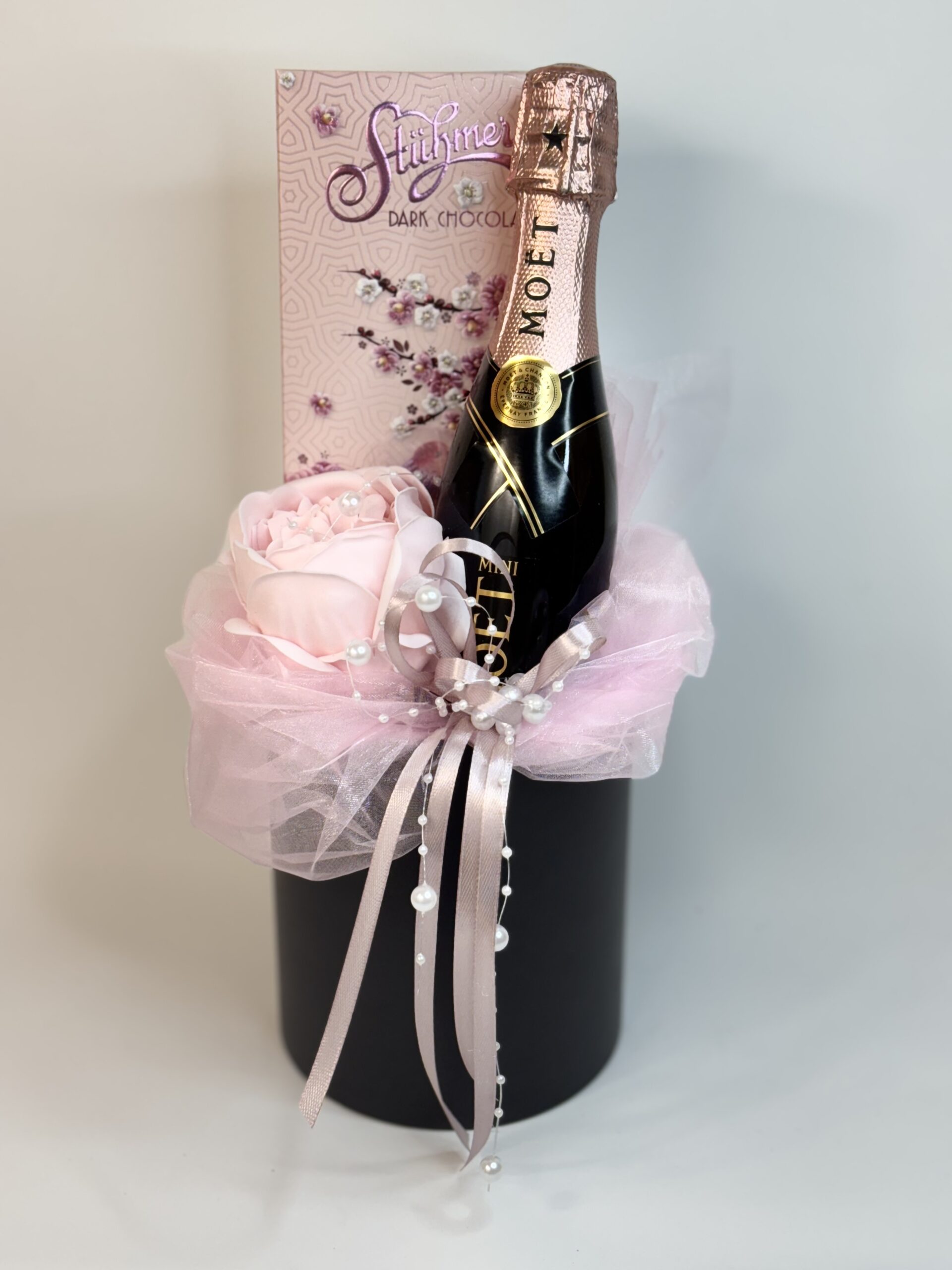 Ajándékozz egy exkluzív pillanatot szerettednek ezzel a kifinomult ajándékdobozzal! A Moët & Chandon mini pezsgő, az elegáns Stühmer csokoládé és a gyönyörű szappanvirág találkozása romantikus és ízléses meglepetéssé teszi ezt a kompozíciót – tökéletes választás születésnapra, évfordulóra vagy bármely különleges alkalomra.