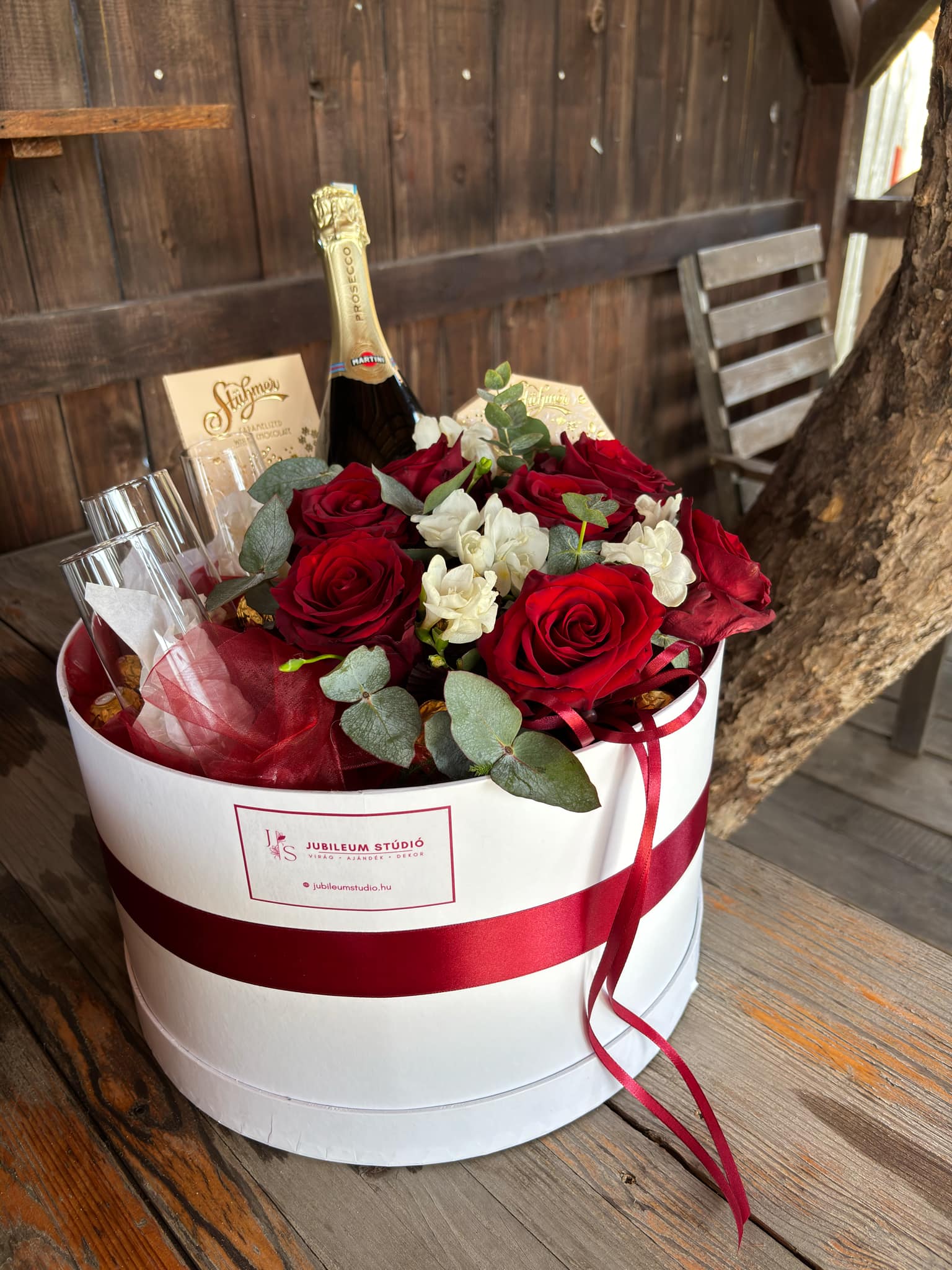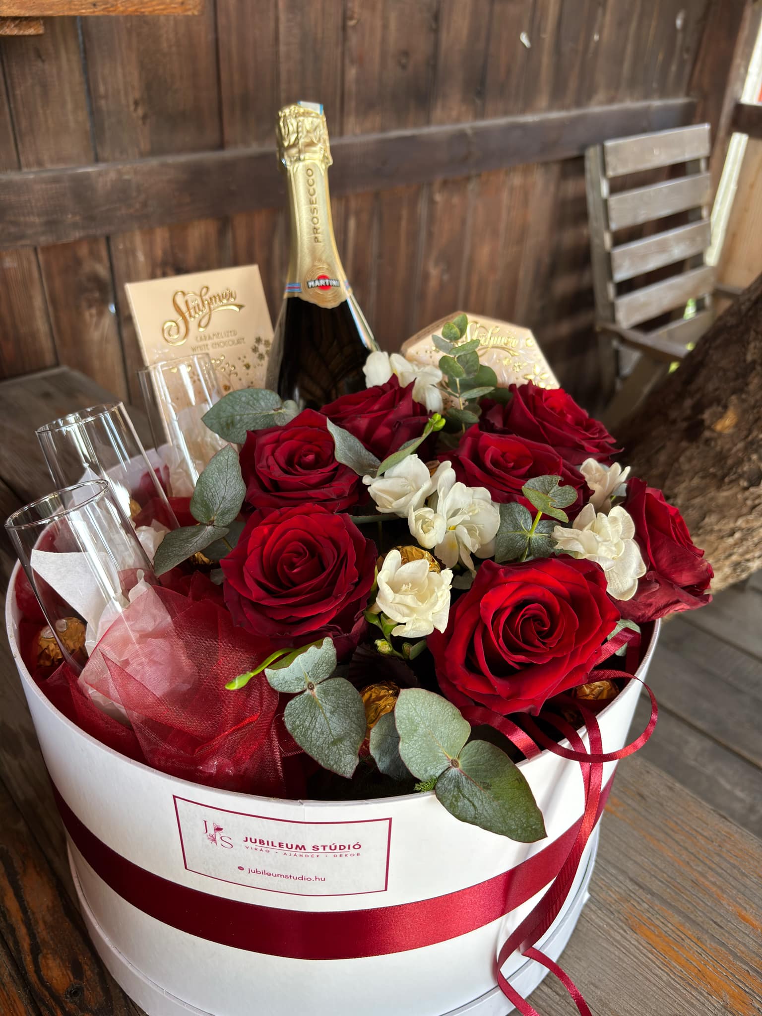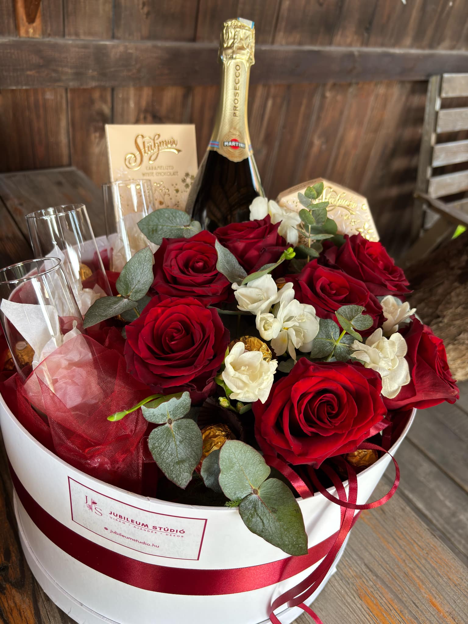 Ez a látványos virágbox tökéletes választás minden alkalomra, amikor igazán maradandó élményt szeretnél ajándékozni. A vörös rózsák klasszikus szépsége és a finom fehér virágok harmonikus kombinációja luxus hatást kelt, amit a prosecco, a bonbonok és a pezsgőspoharak még ünnepibbé tesznek.