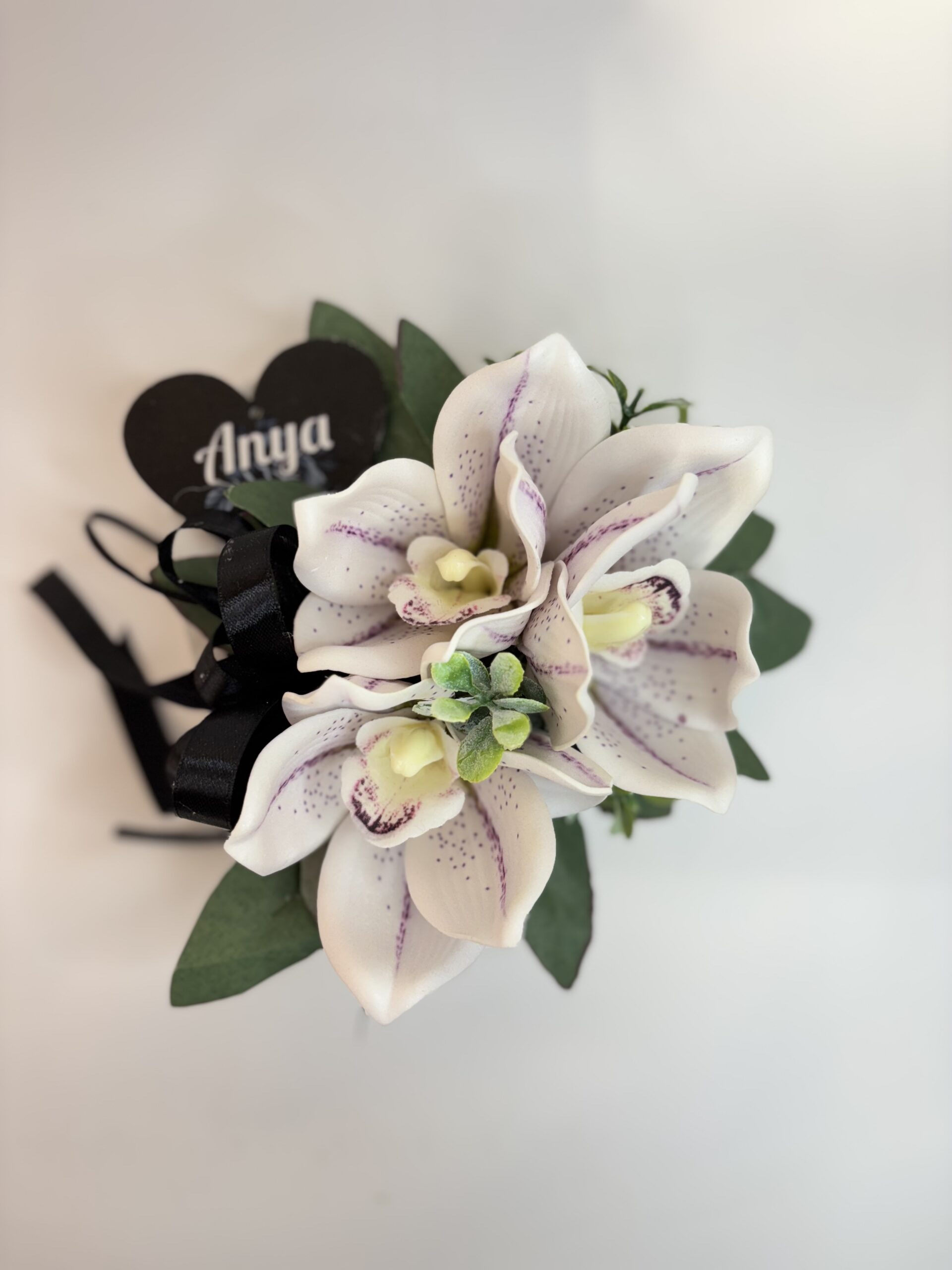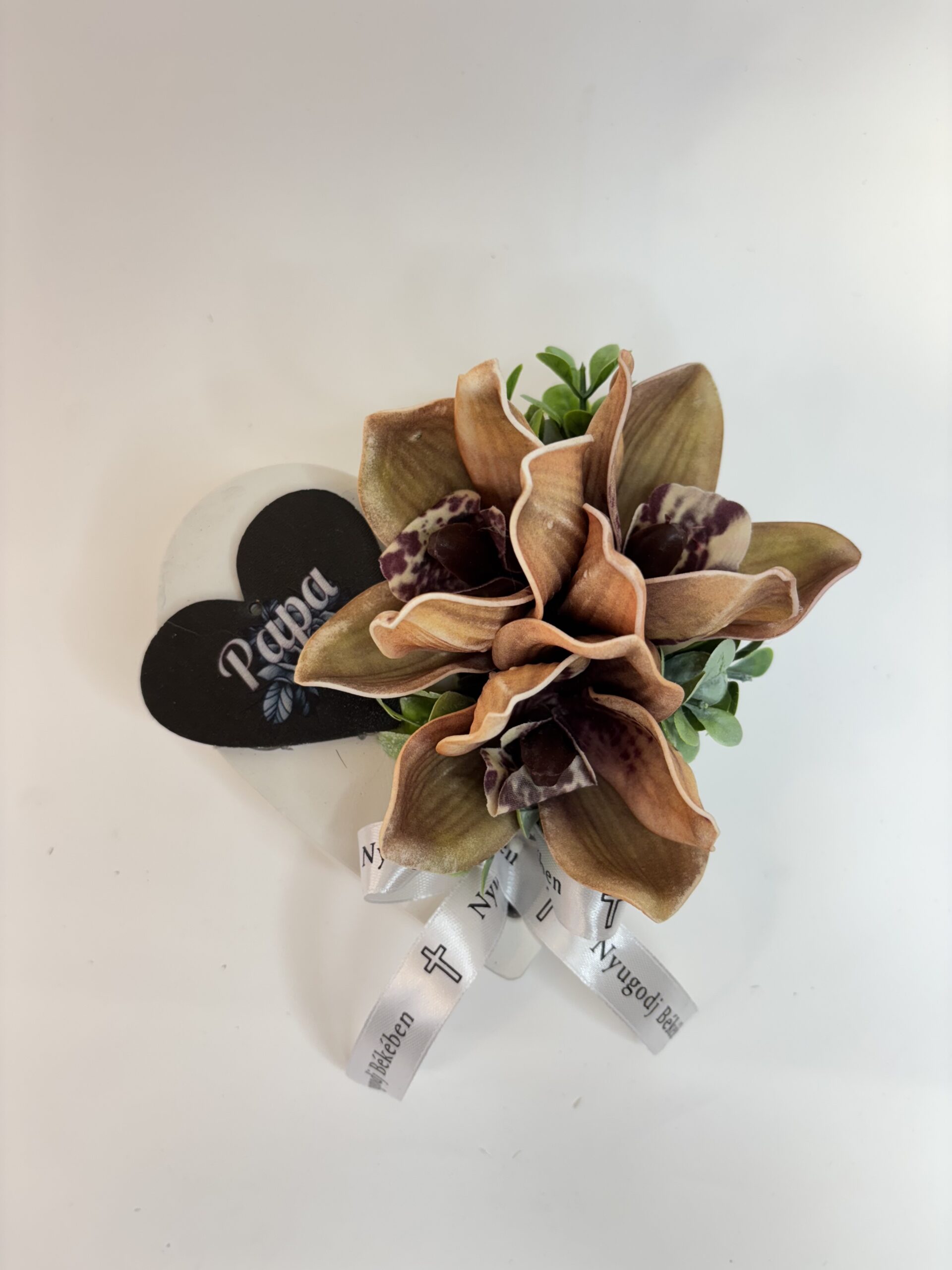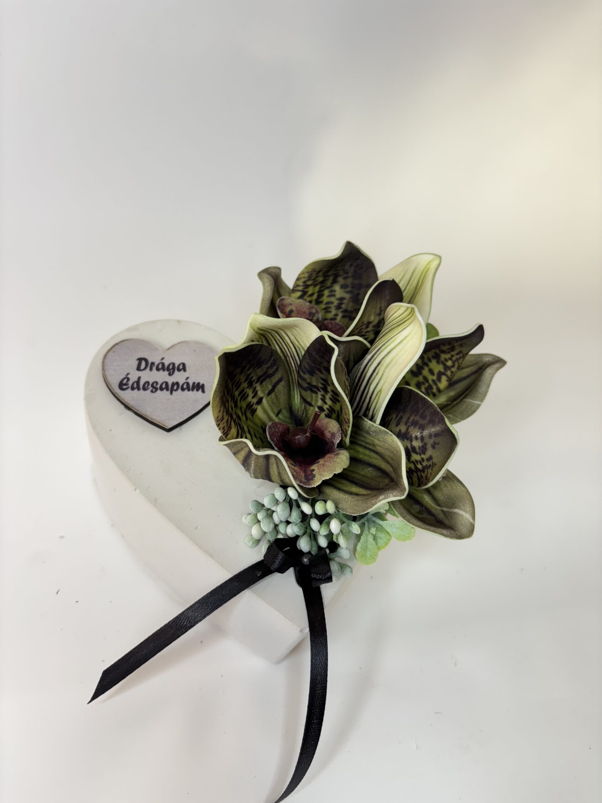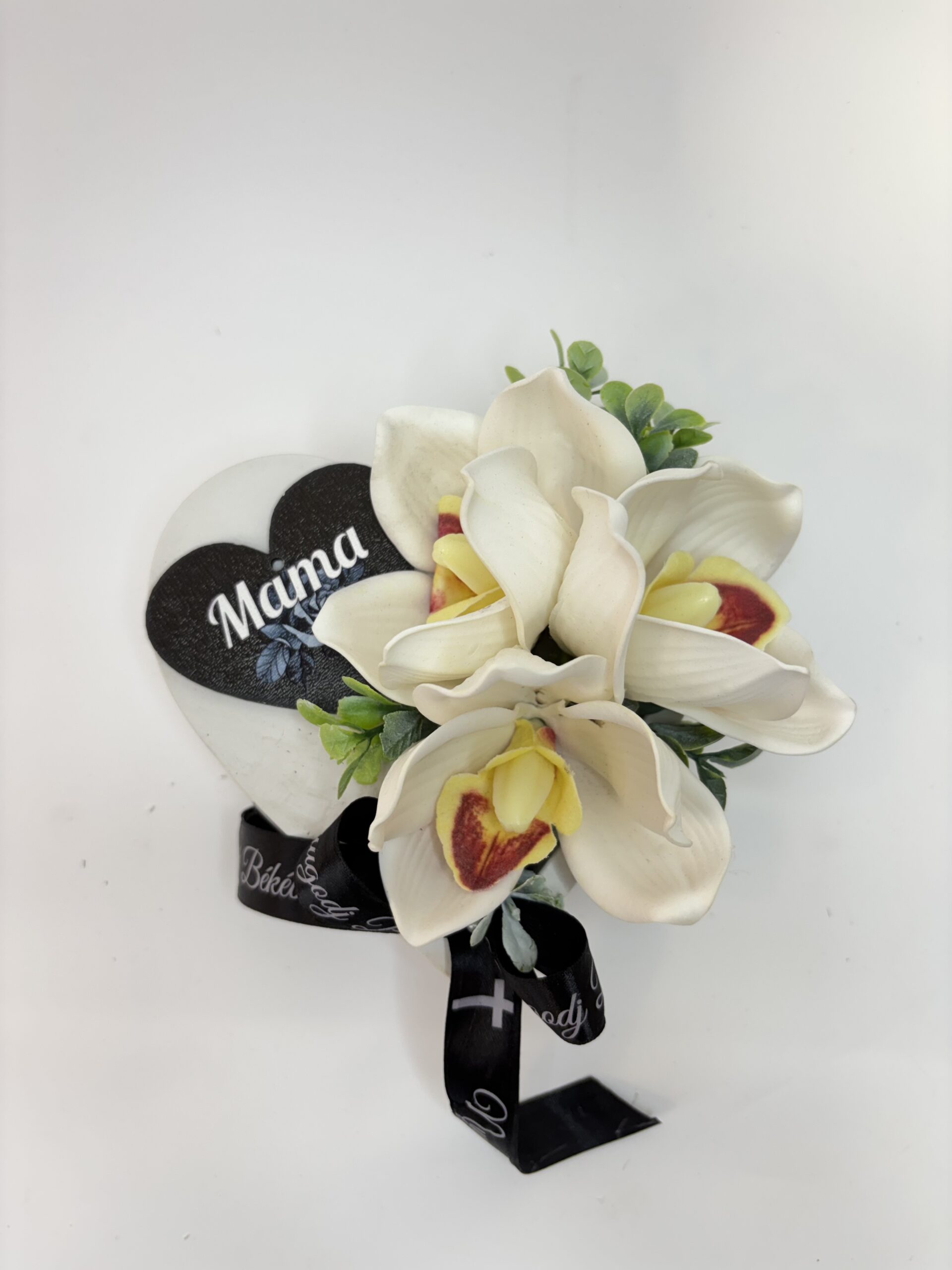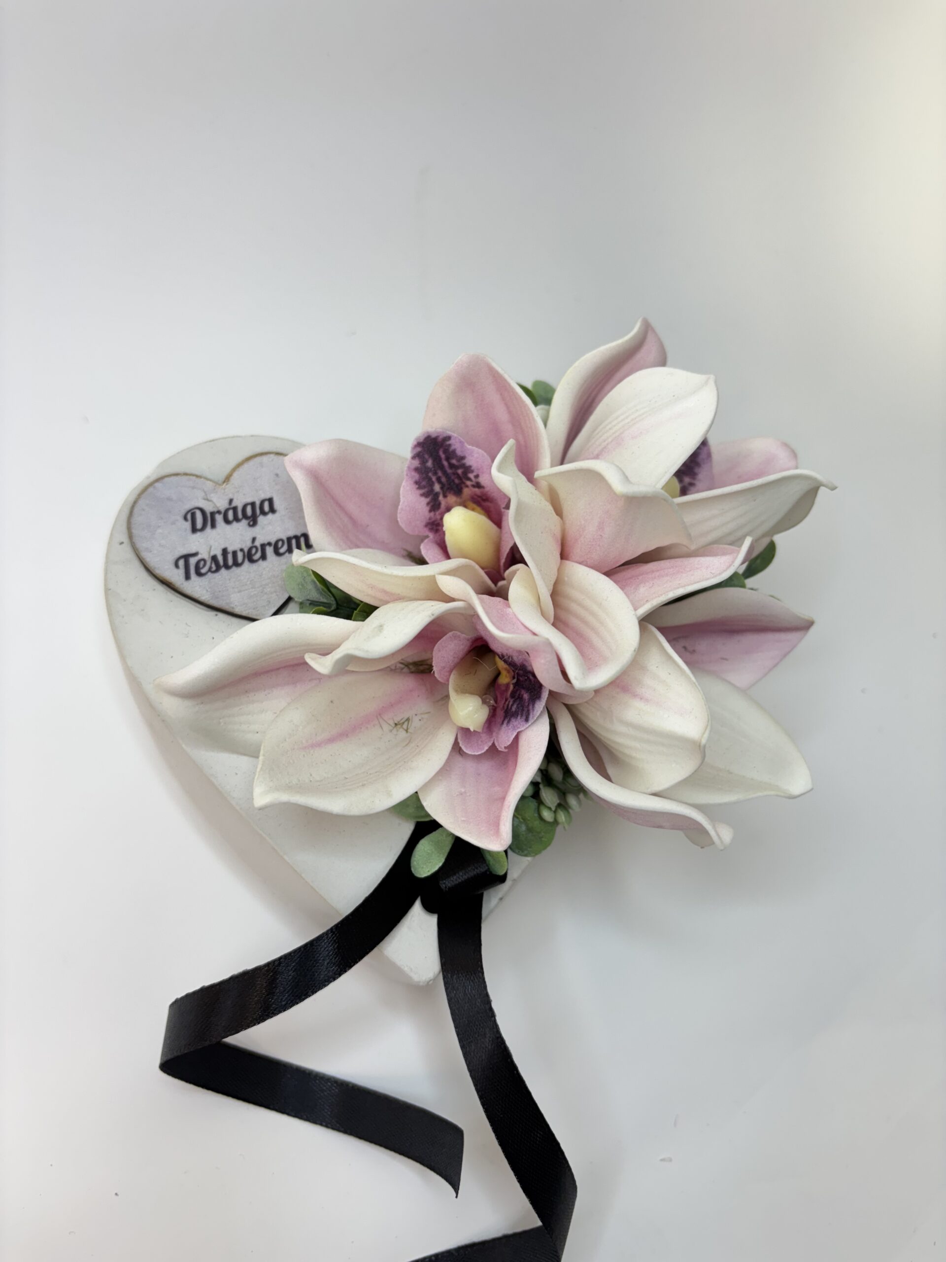 Kézzel készült, szív formájú sírdísz elegáns virágkompozícióval és szalagdísszel. A kompozíciók különböző színekben és felirattal (pl. Anya, Papa, Mama, Drága testvérem, Édesapám) készülnek, de lehetőség van egyedi szöveg kérése alapján is rendelni.