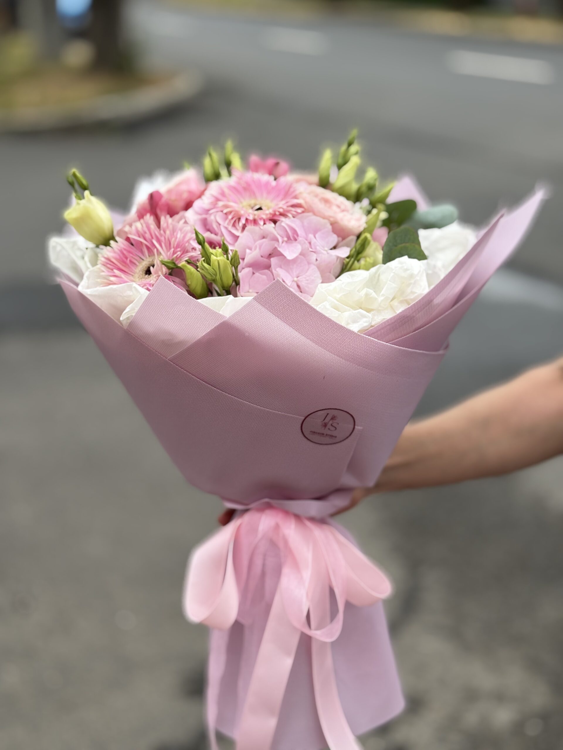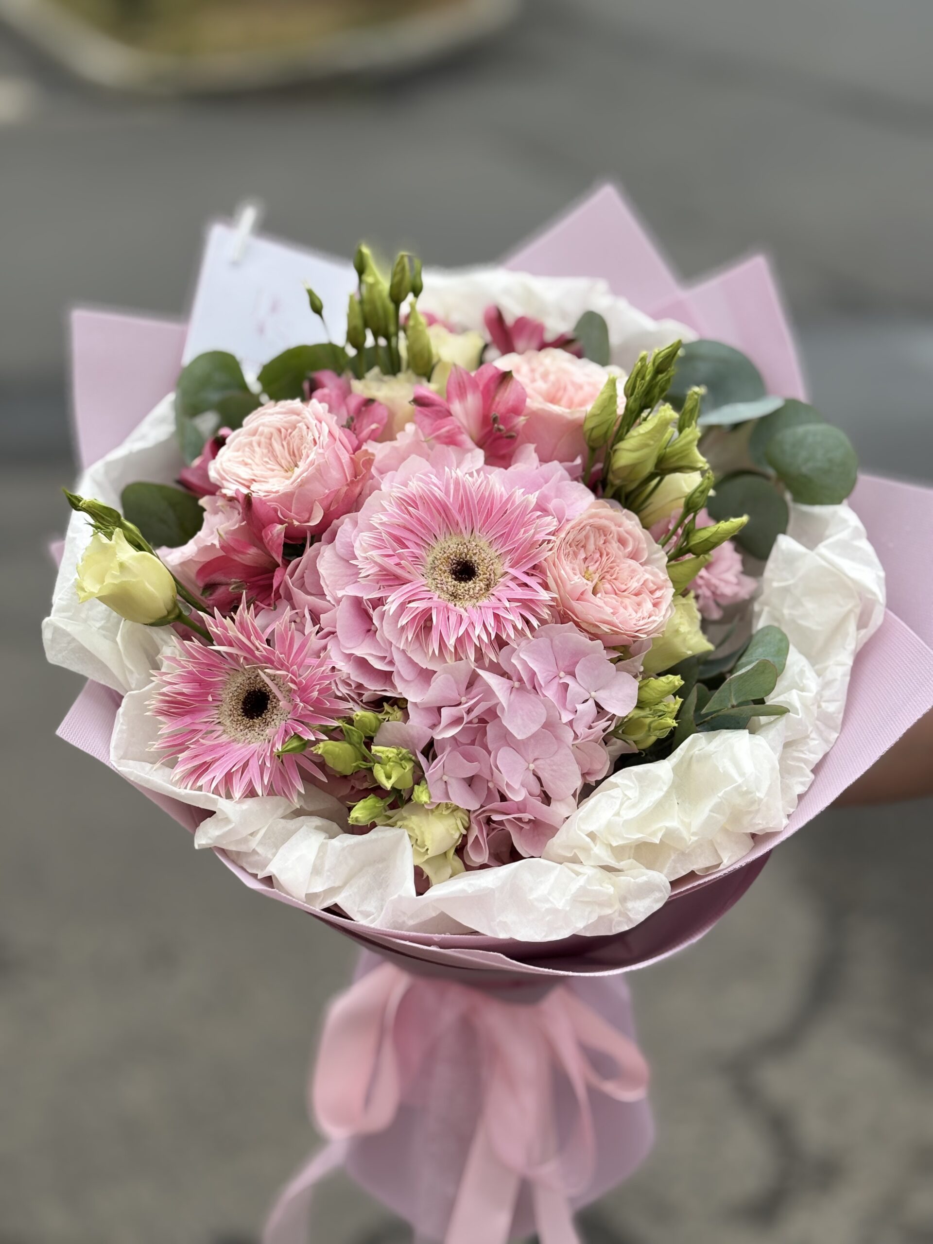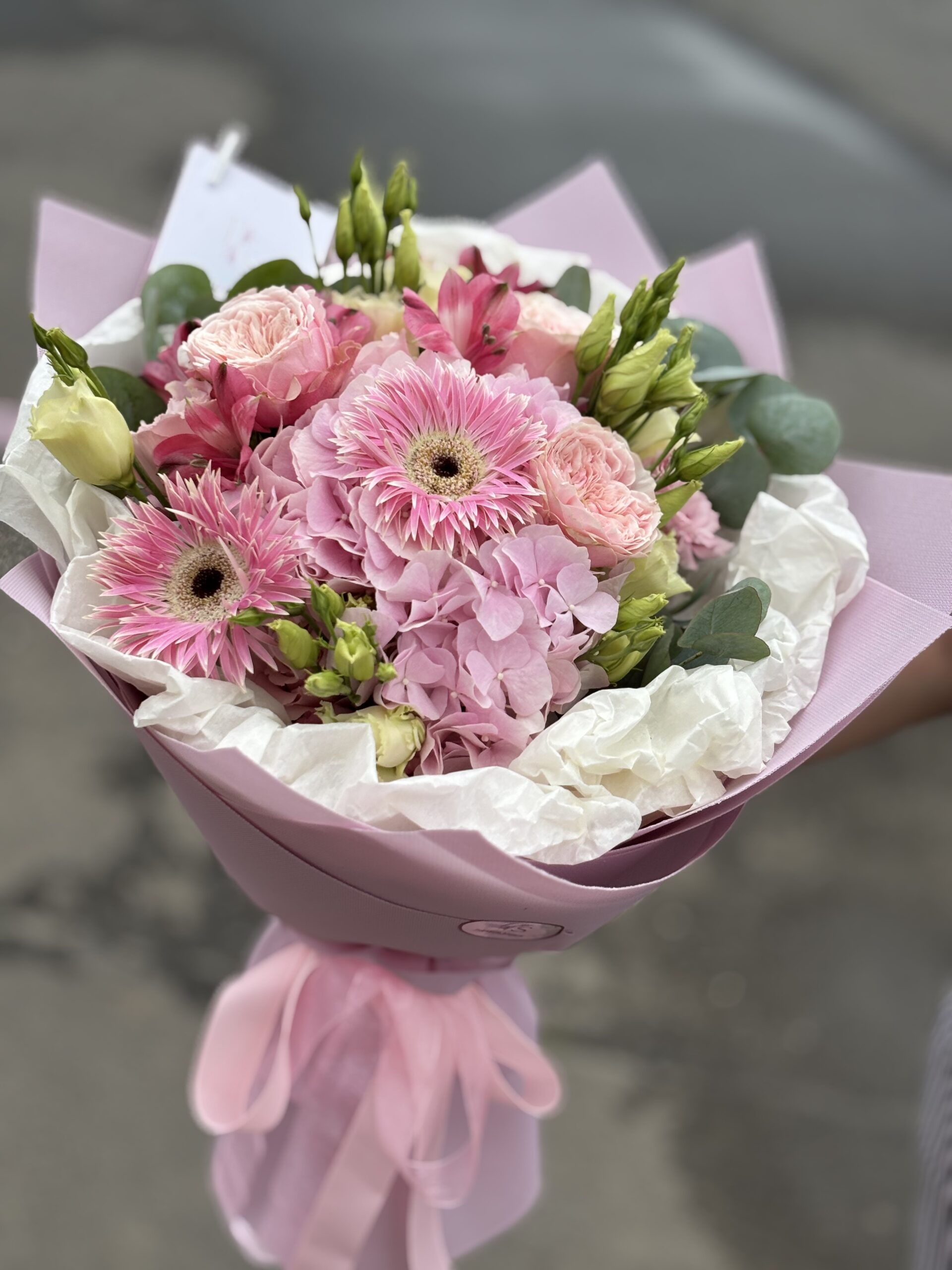 Ez a különleges virágkompozíció rózsaszín hortenzia, gerbera, rózsa, liziantusz és zöldek harmonikus kombinációjával készült. A lágy és élénk árnyalatok kiegyensúlyozott összhangot alkotnak, így ez a csokor bármilyen alkalomra ideális – legyen szó születésnapról, névnapról, vagy egyszerű meglepetésről.